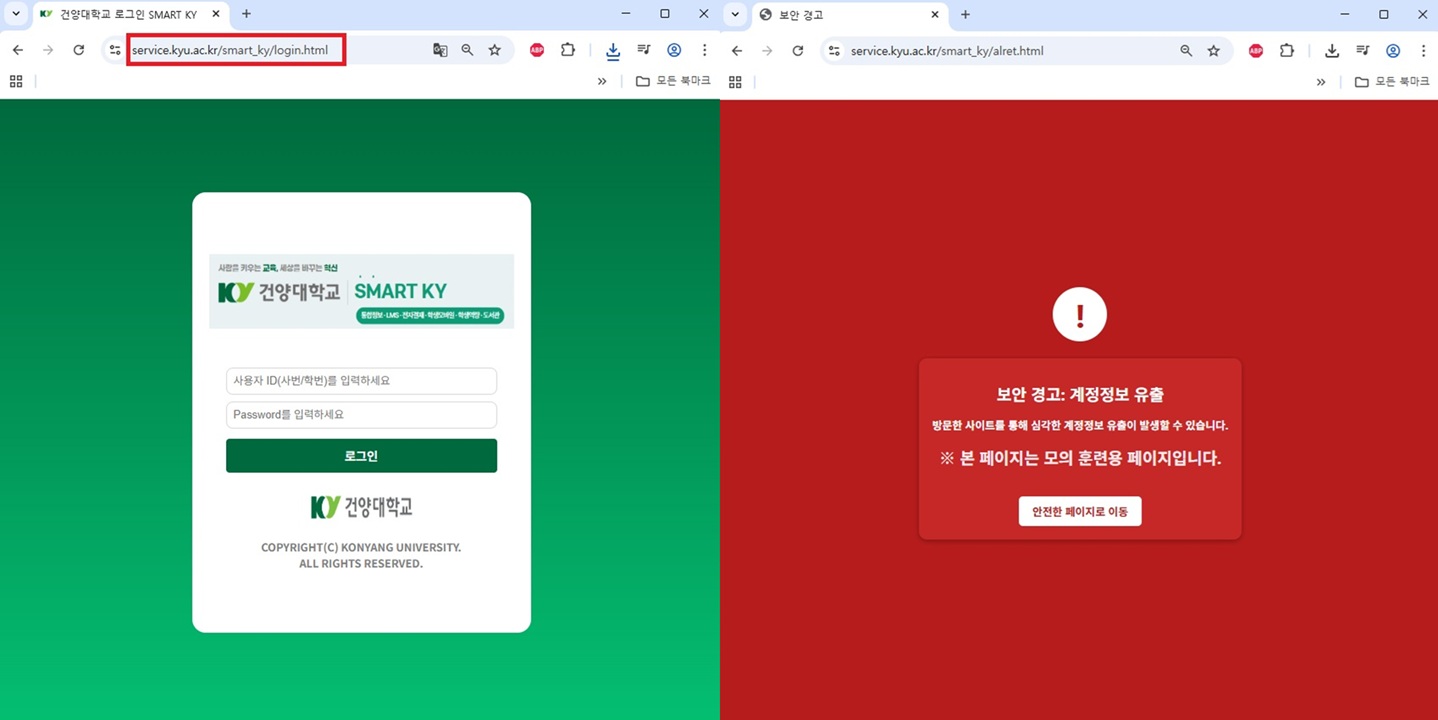 2025년 국내 대규모 계정 정보 유출 사고가 발생함에 따라 유출된 정보를 이용한 2차 피싱 공격이 빈번하게 발생하였습니다. 이에 정보통신원에서는 대학 사용자 보안 인식 수준을 식별하고 경각심을 통해 실제 침해사고 위협에 대응하기 위해 교내 교직원을 대상으로 수행한 모의 훈련을 수행하였습니다. 금번 훈련은 이메일 기반 피싱 메일 유포 방식으로 사용자의 훈련용 피싱 페이지 접속 유도를 통해 대응 결과(신고, 계정정보 입력, 유출 등)을 확인하였으며 교원, 직원(조교) 그룹으로 구분하여 2차에 걸쳐 수행되었습니다.