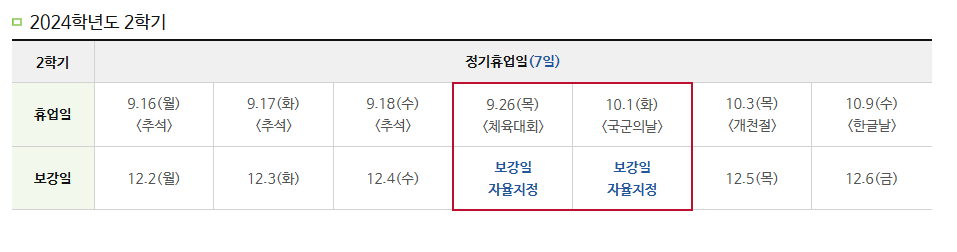 『 2024학년도 2학기 지정보강일 안내 』글의 상세내용을 확인하는 표로 제목, 부서명, 등록일, 조회, 첨부, 내용으로 나뉘어 설명합니다.