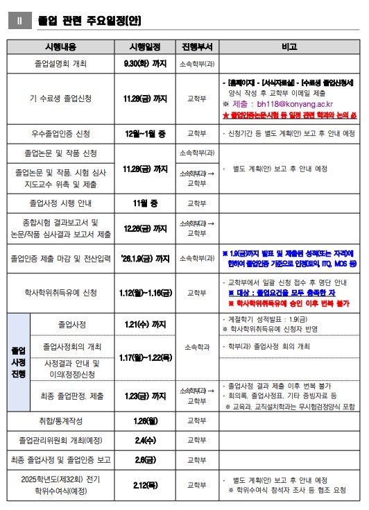 | 제목 | [교무 관련] 2025학년도(제32회) 전기 졸업사정 일정 및 주요사항 안내 | ||||